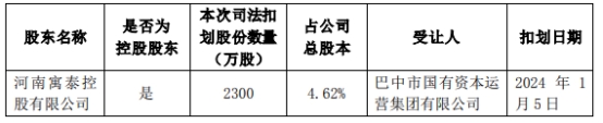 公告显示,寓泰控股本次权益变动系因合同纠纷导致所持公司股份4.62%被司法扣划至巴中市国有资本运营集团有限公司,以及前期因未能归还财通证券股份有限公司融资债务被动减持公司股份0.31%、前期因合同纠纷导致被动减持公司股份0.18%。