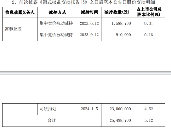 2023年6月12日,寓泰控股通过集中竞价被动减持公司1,588,700股,占上市公司总股本比例0.31%;2023年9月12日,寓泰控股通过集中竞价被动减持公司910,000股,占上市公司总股本比例0.18%;2024年1月5日,寓泰控股被司法扣划23,000,000股,占上市公司总股本比例4.62%。