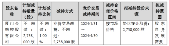 清源股份昨日晚间披露公告称,厦门金融控股有限公司(以下简称“厦门金控”)计划于公告披露日起15个交易日后的3个月内(即2024年1月31日至2024年4月30日),通过集中竞价方式累计减持不超过其所持有的清源科技股份有限公司股份2,738,000股,合计占清源科技股份有限公司总股本的1.00%。