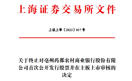 中国经济网北京1月11日讯 上交所网站日前公布关于终止对亳州药都农村商业银行股份有限公司(简称“药都银行”)首次公开发行股票并在主板上市审核的决定。