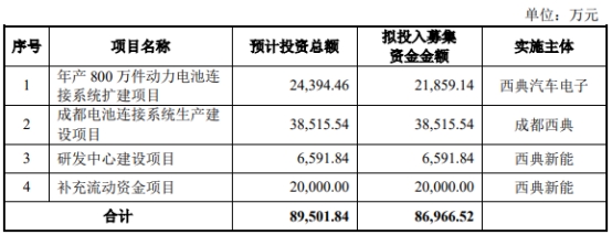 西典新能本次发行募集资金总额117,240.80万元,募集资金净额为107,302.53万元,较原计划多20336.01万元。西典新能2024年1月8日披露的招股书显示,公司拟募集资金86,966.52万元,计划用于年产800万件动力电池连接系统扩建项目、成都电池连接系统生产建设项目、研发中心建设项目、补充流动资金项目。