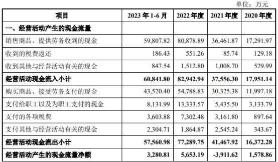 2020年至2023年1-6月,西典新能销售商品、提供劳务收到的现金分别为17,291.97万元、36,461.87万元、80,878.89万元、59,807.82万元,经营活动产生的现金流量净额分别为1,578.86万元、-3,911.62万元、5,653.19万元、3,280.81万元。