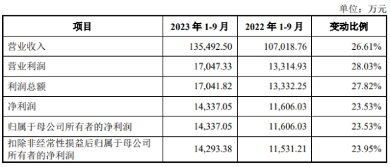 2023年1-9月,公司营业收入为135,492.50万元,较去年同期增长26.61%;归属于母公司所有者的净利润为14,337.05万元,较去年同期增长23.53%,扣除非经常性损益后归属于母公司所有者的净利润为14,293.38万元,较去年同期增长23.95%。