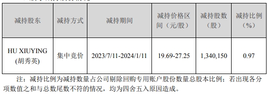 2023年7月11日至2024年1月11日,HU XIUYING(胡秀英)通过集中竞价方式减持股份1,340,150股,减持比例0.97%,减持价格区间19.69元/股至27.25元/股。
