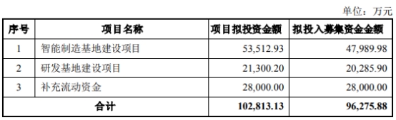 根据相关法律、法规和规范性文件的规定并结合公司财务状况和投资计划,本次拟发行可转换公司债券募集资金总额不超过人民币96,275.88万元(含发行费用),扣除发行费用后拟用于以下项目:智能制造基地建设项目、研发基地建设项目、补充流动资金。
