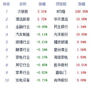 板块方面,酒店及餐饮、景点及旅游、机场航运涨幅居前,黑色家电、汽车服务、油气开采及服务跌幅居前。