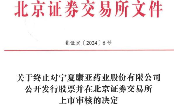 中国经济网北京1月17日讯 北交所网站日前公布关于终止对宁夏康亚药业股份有限公司(简称“康亚药业”)公开发行股票并在北京证券交易所上市审核的决定。