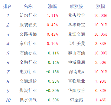 午评:创业板指半日跌1.21% 服装纺织板块领涨