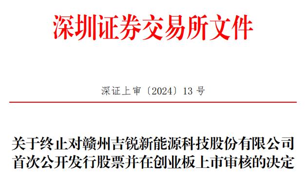 中国经济网北京1月18日讯 据深交所官网消息,深交所决定终止赣州吉锐新能源科技股份有限公司(以下简称“吉锐科技”)首次公开发行股票并在创业板上市审核。