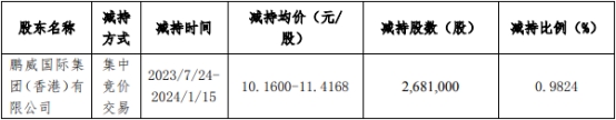 香港鹏威于2023年7月24日至2024年1月15日减持公司股票数量2,681,000股,减持比例为0.9824%,减持均价为10.1600元/股至11.4168元/股。