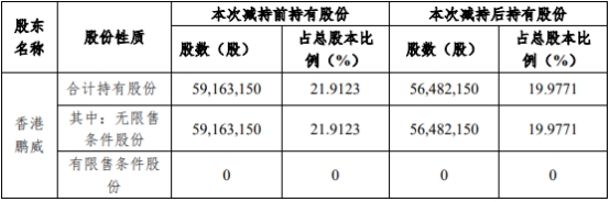 本次减持前,香港鹏威持有公司59,163,150股,占总股本比例21.9123%;本次减持后,香港鹏威持有公司56,482,150股,占总股本比例19.9771%。