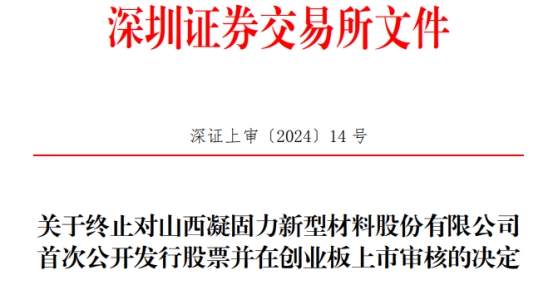 中国经济网北京1月19日讯 深交所网站昨日公布关于终止对山西凝固力新型材料股份有限公司(以下简称“凝固力”)首次公开发行股票并在创业板上市审核的决定。