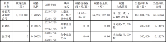 截至公告披露日,本次减持股份计划时间区间已届满,控股股东睿能实业通过大宗交易和集中竞价方式合计减持公司股份3,590,000股,占公司股份总数(210,229,575股)的1.7077%,减持价格区间为14.05元/股至20.10元/股,减持总金额为5725.73万元;公司董事、副总经理赵健民、副总经理张国利未实施本次减持股份计划,其持有的公司股份数未发生变动。