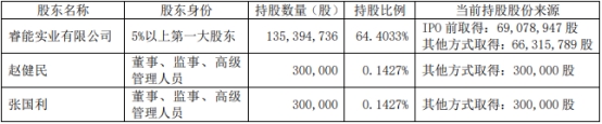 本次减持计划实施前,公司控股股东睿能实业持有公司无限售条件流通股135,394,736股,占公司股份总数(210,229,575股)的64.4033%。上述股份来源于公司首次公开发行股票前取得的股份,及上市后公司资本公积金转增股本增加的股份,均于2020年7月5日解除限售并上市流通。公司董事、副总经理赵健民、副总经理张国利分别持有公司股份300,000股,分别占公司股份总数(210,229,575股)的0.1427%,上述股份来源于公司2021年限制性股票激励计划授予的股份。