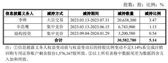 风语筑昨日晚间披露关于控股股东及其一致行动人权益变动的提示性公告及简式权益变动报告书。公司于近日收到控股股东李晖、辛浩鹰及上海励构投资合伙企业(有限合伙)(以下简称“励构投资”)编制的《简式权益变动报告书》,李晖于2023年3月13日至2023年7月31日减持20,638,300股,减持比例3.47%;辛浩鹰于2023年3月13日至2023年6月15日减持6,743,900股,减持比例1.13%;励构投资于2023年9月4日至2024年1月29日减持3,200,580股,减持比例0.54%。李晖、辛浩鹰及励构投资合计减持30,582,780股,减持比例5.14%。