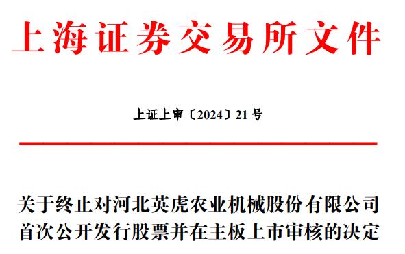 中国经济网北京2月1日讯 据上交所官网消息,上交所决定终止河北英虎农业机械股份有限公司(以下简称“英虎机械”)首次公开发行股票并在主板上市审核。
