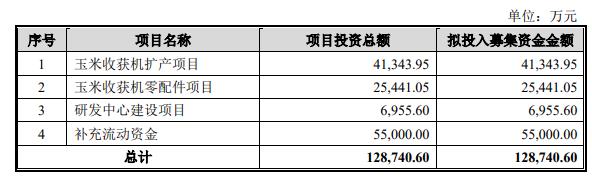 英虎机械原拟发行股票数量不超过2,500万股,本次公开发行股票数量占发行后公司总股本不低于25.00%,不进行老股转让。英虎机械原拟募集资金128,740.60万元,分别用于玉米收获机扩产项目、玉米收获机零配件项目、研发中心建设项目、补充流动资金。