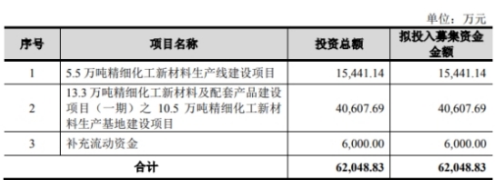 恒光股份本次发行募集资金总额为6.05亿元,扣除发行费用后募集资金净额为5.41亿元。 恒光股份最终募集资金净额比原计划少7968万元。恒光股份于11月11日披露的招股说明书显示,该公司拟募集资金6.20亿元,拟分别用于5.5万吨精细化工新材料生产线建设项目、13.3万吨精细化工新材料及配套产品建设项目(一期)之10.5万吨精细化工新材料生产基地建设项目、补充流动资金。