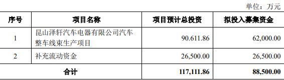 本次向特定对象发行股票募集资金总额预计不超过88,500.00万元(含本数),扣除发行费用后的募集资金净额将用于昆山泽轩汽车电器有限公司汽车整车线束生产项目、补充流动资金。