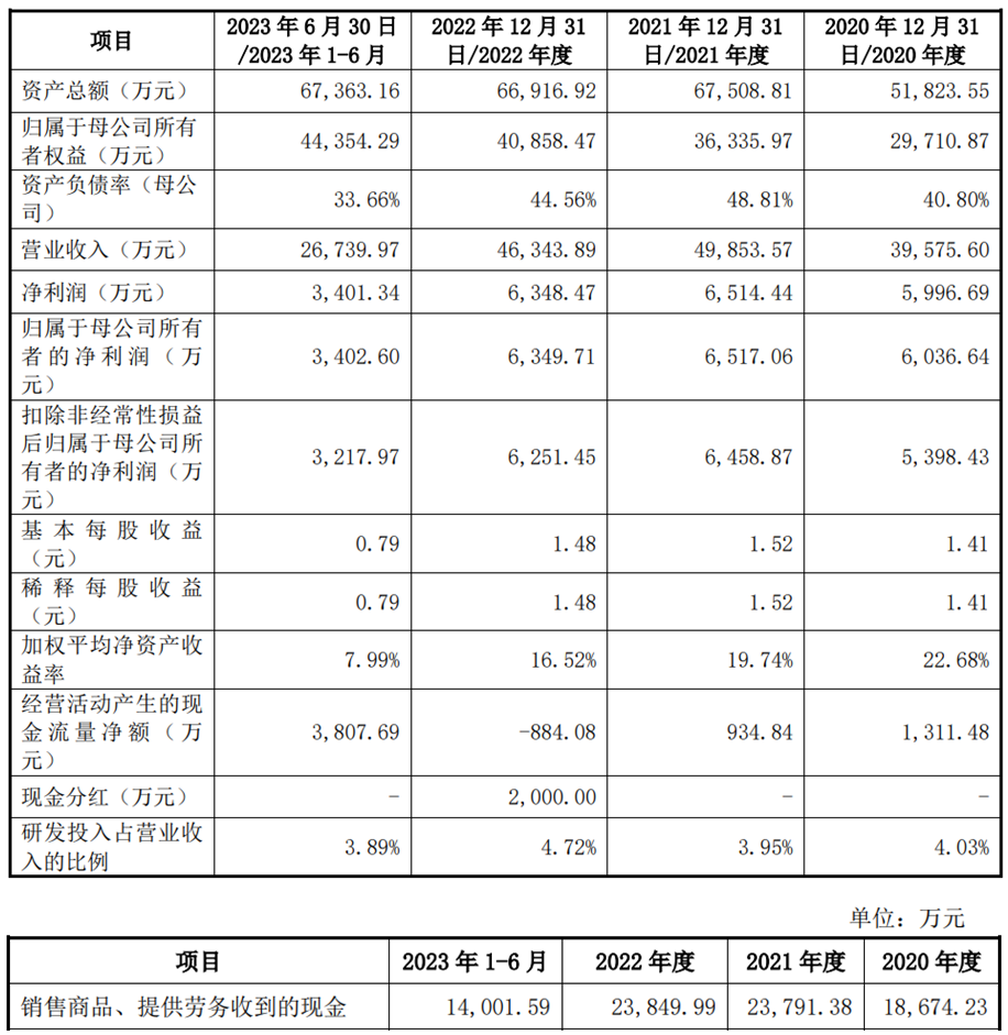 上述同期,公司销售商品、提供劳务收到的现金分别为18,674.23万元、23,791.38万元、23,849.99万元和14,001.59万元;经营活动产生的现金流量净额分别为1,311.48万元、934.84万元、-884.08万元和3,807.69万元。