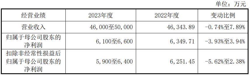 经管理层初步预测,2023年度华阳智能的营业收入为46,000万元至50,000万元,同比变动-0.74%至7.89%;归属于母公司股东的净利润6,100万元至6,600万元,同比变动-3.93%至3.94%;扣除非经常性损益后归属于母公司股东的净利润5,900万元至6,400万元,同比变动-5.62%至2.38%。