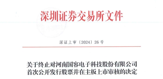 深交所于2023年5月19日依法受理了国容股份首次公开发行股票并在主板上市的申请文件,并依法依规进行了审核。2024年1月19日,国容股份向深交所提交了《河南国容电子科技股份有限公司关于撤回首次公开发行股票并在主板上市申请文件的申请》,保荐人向深交所提交了《中原证券股份有限公司关于撤回河南国容电子科技股份有限公司首次公开发行股票并在主板上市申请文件的申请》。根据《深圳证券交易所股票发行上市审核规则》第六十二条的有关规定,深交所决定终止对国容股份首次公开发行股票并在主板上市的审核。