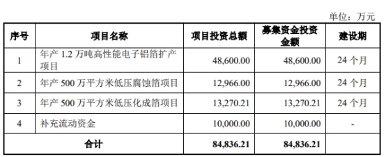 国容股份原拟在深交所公开发行股票的数量不超过4,839.33万股,占发行后总股本的比例不低于25%。公司原拟募集资金84,836.21万元,计划分别用于年产1.2万吨高性能电子铝箔扩产项目、年产500万平方米低压腐蚀箔项目、年产500万平方米低压化成箔项目、补充流动资金。