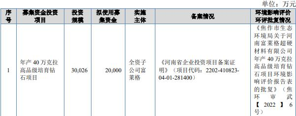 公司原拟募集资金20,000万元,计划用于年产40万克拉高品级培育钻石项目。