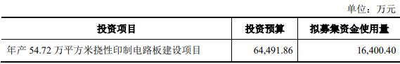 弘信电子2017年5月11日披露的《首次公开发行股票并在创业板上市招股说明书》显示,公司计划募集资金16,400.40万元,拟全部用于年产54.72万平方米挠性印制电路板建设项目。