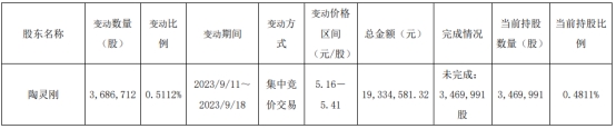 公告显示,陶灵刚当前持股数量为3,469,991股,当前持股比例为0.4811%。