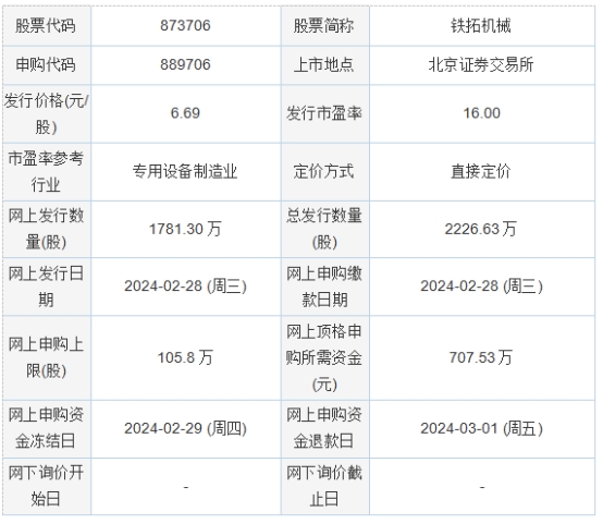 今日申购:铁拓机械