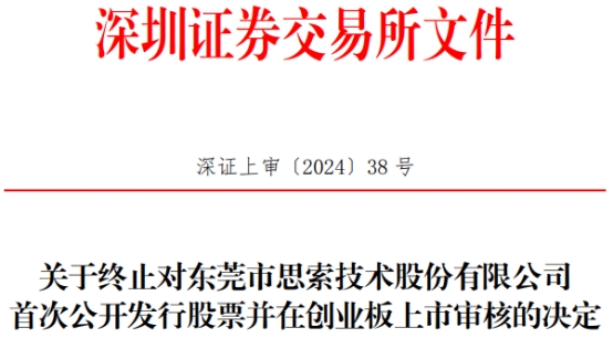 2024年1月26日,思索技术向深交所提交了《关于撤回东莞市思索技术股份有限公司首次公开发行股票并在创业板上市申请文件的请示》,保荐人向深交所提交了《五矿证券有限公司关于撤回东莞市思索技术股份有限公司首次公开发行股票并在创业板上市的请示》。根据《深圳证券交易所股票发行上市审核规则》第六十二条的有关规定,深交所决定终止对思索技术首次公开发行股票并在创业板上市的审核。