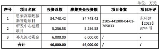 思索技术原拟在深交所创业板公开发行股票不超过1,319.80万股,不低于发行后总股本的25%,原拟募集自资金46,000.00万元,用于思索高端连接器智造项目、研发中心建设项目、补充流动资金。