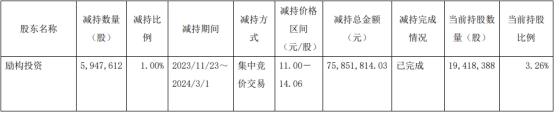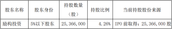 截至公告披露日,励构投资持有公司股份19,418,388股,约占公司总股本的3.26%。本次减持前,励构投资持有公司股份25,366,000股,持股比例4.26%。