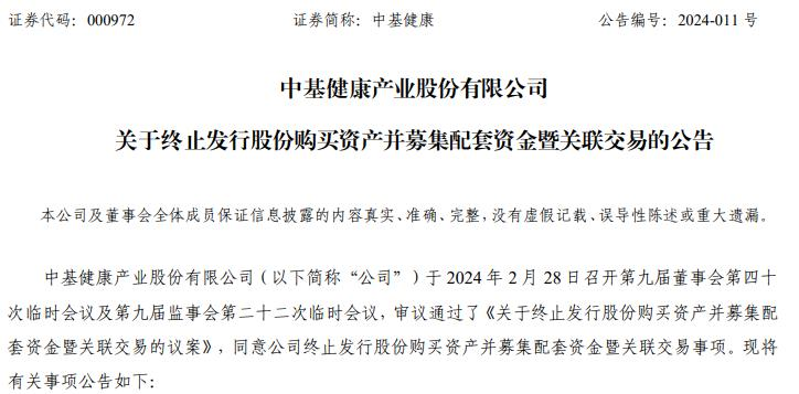 中国经济网北京3月4日讯 中基健康(000972.SZ)2月29日晚披露《关于终止发行股份购买资产并募集配套资金暨关联交易的公告》称,公司于2024年2月28日召开第九届董事会第四十次临时会议及第九届监事会第二十二次临时会议,审议通过了《关于终止发行股份购买资产并募集配套资金暨关联交易的议案》,同意公司终止发行股份购买资产并募集配套资金暨关联交易事项。