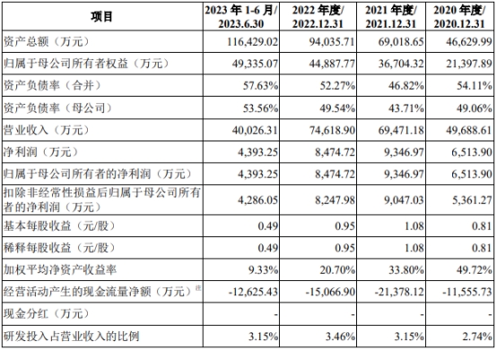2020年至2023年1-6月,美新科技营业收入分别为49,688.61万元、69,471.18万元、74,618.90万元、40,026.31万元,净利润分别为6,513.90万元、9,346.97万元、8,474.72万元、4,393.25万元,归属于母公司所有者的净利润分别为6,513.90万元、9,346.97万元、8,474.72万元、4,393.25万元,扣除非经常性损益后归属于母公司所有者的净利润分别为5,361.27万元、9,047.03万元、8,247.98万元、4,286.05万元。