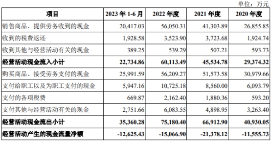 2020年至2023年1-6月,美新科技销售商品、提供劳务收到的现金分别为26,855.85万元、41,303.89万元、56,050.31万元、20,417.03万元,经营活动产生的现金流量净额分别为-11,555.73万元、-21,378.12万元、-15,066.90万元、-12,625.43万元。