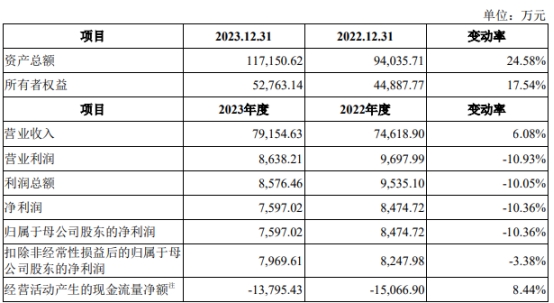 2023年全年,美新科技营业收入为79,154.63万元,同比变动6.08%;净利润/归属于母公司股东的净利润为7,597.02万元,同比变动-10.36%;扣除非经常性损益后的归属于母公司股东的净利润为7,969.61万元,同比变动-3.38%;经营活动产生的现金流量净额为-13,795.43万元,同比变动8.44%。