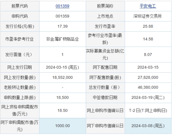 平安电工2024年3月14日披露首次公开发行股票并在主板上市发行公告,公司本次募投项目预计使用募集资金为80,822.15万元。按本次发行价格17.39元/股计算,发行人预计募集资金80,654.82万元,扣除发行费用7,900.32万元(不含增值税)后,预计募集资金净额为72,754.50万元。