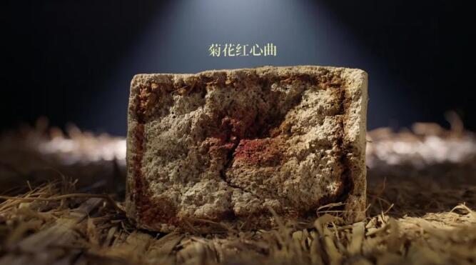 菊花红心曲传承自濉溪千年古法工艺,全国独树一帜,被载入中国轻工业部《白酒工业手册》。作为糖化发酵剂,采用“拉皮”“上垛挤潮”等古法制成,曲块剖面具有独有的“两圈一点红”的特征:棕红色的曲心,外围有两道褐色圈纹。酒曲色泽明亮,具有浓厚的曲香味,使口子窖酒得以保留延续千年的独有风味,是成就口子窖酒独特风格的灵魂。