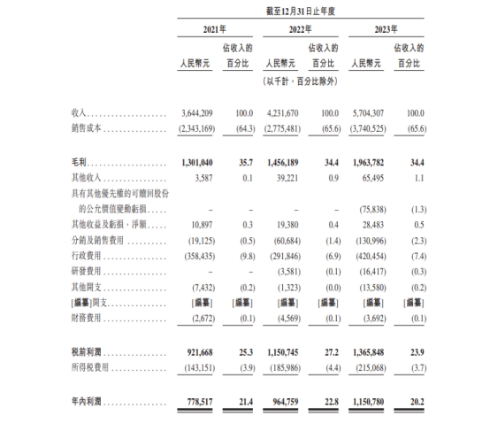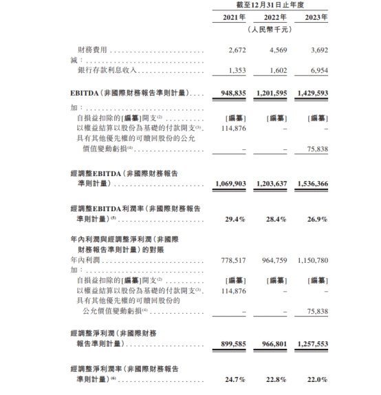2021年、2022年、2023年,茶百道的收入分别为36.44亿元、42.32亿元、57.04亿元;年内利润分别为7.79亿元、9.65亿元、11.51亿元;经调整净利润(非国际财务报告准则计量)分别为9.00亿元、9.67亿元、12.58亿元。