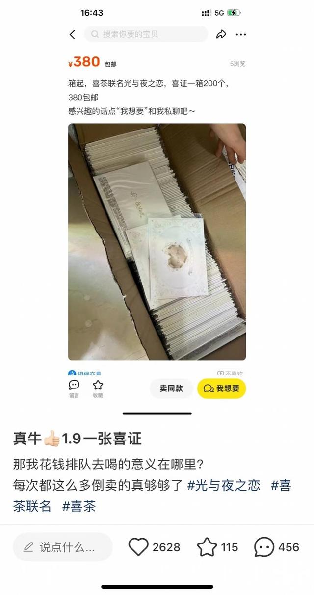 3月21日,有网友在社交平台发文称,在二手平台闲鱼上,喜茶与光与夜之恋的周边“喜证”被倒卖至1.9元一张。该网友质疑“那我花钱排队去喝的意义在哪里?”该网友分享的图片显示,有卖家在闲鱼上发布消息称,喜证一箱200张,价格在380元。