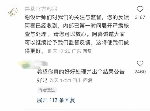 而在该帖子下,喜茶官方客服留言称,内部已第一时间展开严肃核查与处理,诚邀消费者继续给予监督反馈。
