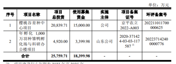 樱桃谷原拟在上交所主板公开发行新股不超过4,445万股;原拟募集资金18,399.98万元,计划用于樱桃谷育种中心项目、年孵化1,000万羽种雏鸭孵化场与科研办公楼项目。