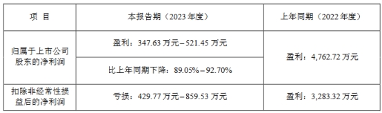 根据业绩预告公告,2023年,本川智能归属于上市公司股东的净利润347.63万元至521.45万元,比上年同期下降89.05%至92.70%;扣除非经常性损益后的净利润亏损429.77万元至859.53万元。