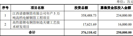 本次向特定对象发行股票拟募集资金总额不超过250000.00万元(含本数),扣除发行费用后的募集资金净额将用于江西诺德铜箔有限公司年产5万吨高档电解铜箔工程项目、高性能锂电铜箔制造关键工艺技术研发项目。