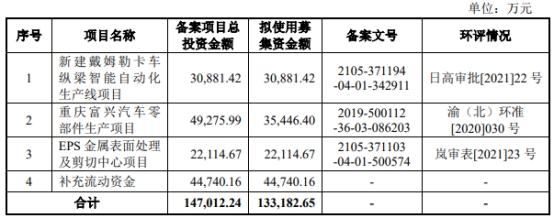兴业汽配原拟在上交所主板发行不超过5,000万股,不低于本次发行后总股本的25%。本次发行股份全部为公开发行新股,不涉及公司股东公开发售股份。兴业汽配原拟募集资金133,182.65万元,分别用于新建戴姆勒卡车纵梁智能自动化生产线项目、重庆富兴汽车零部件生产项目、EPS金属表面处理及剪切中心项目、补充流动资金。