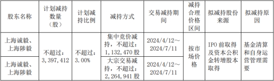 公告显示,上海诚毅和上海陟毅拟通过集中竞价交易方式和大宗交易方式减持所持有的公司股票,减持数量合计不超过3,397,412股,即合计减持比例不超过公司总股本的3.00%。