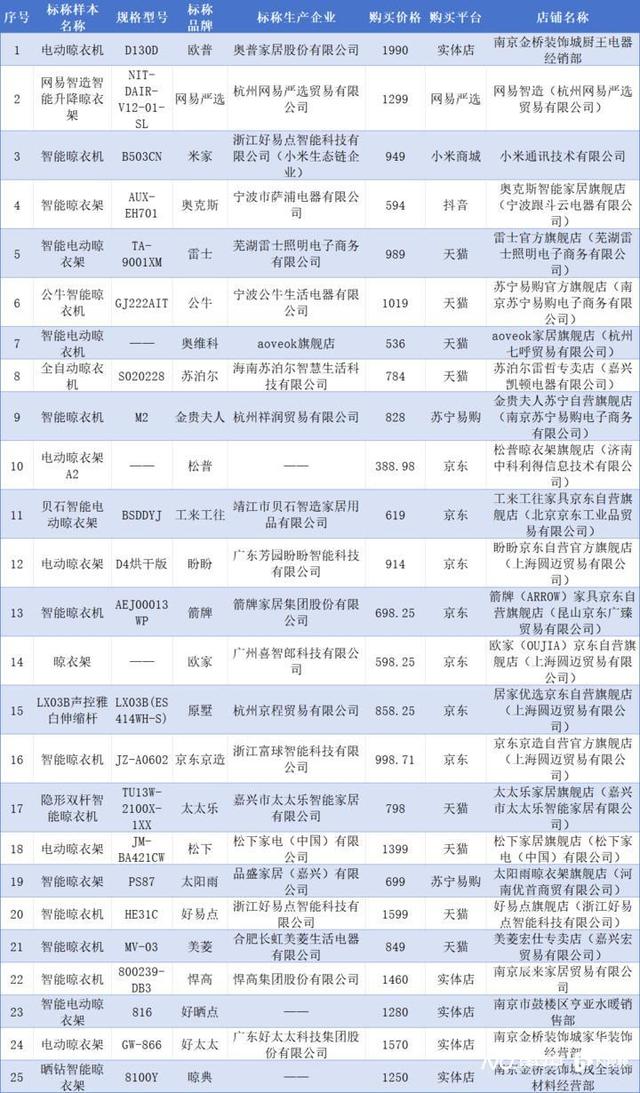 据了解,本次比较试验的25款智能晾衣架样品,分别在天猫、京东等6家电商平台以及5家实体店购买,涉及品牌包括欧普、网易严选、米家、奥克斯、雷士、公牛、奥维科、苏泊尔、金贵夫人、松普、公来公往、盼盼、箭牌、欧家、原墅、京东京造、太太乐、松下、太阳雨、好易点、美菱、悍高、好晒点、好太太、晾点,价格从536元到1990元不等。