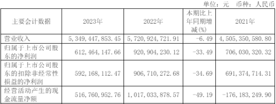 2023年年度报告显示,国邦医药去年实现营业收入53.49亿元,同比减少6.49%;归属于上市公司股东的净利润6.12亿元,同比减少33.49%;归属于上市公司股东扣除非经常性损益净利润5.92亿元,同比减少34.69%;经营活动产生的现金流量净额5.17亿元,同比减少49.19%。